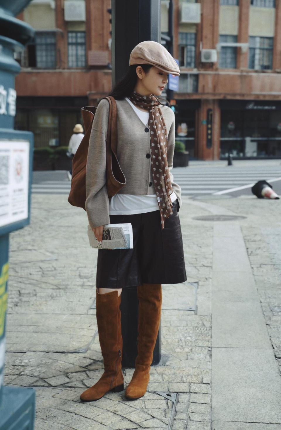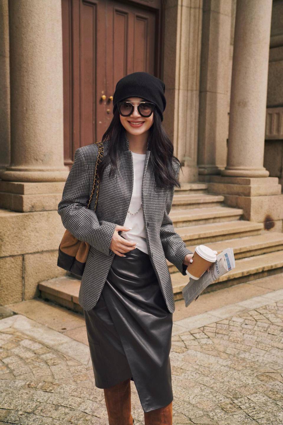 用的是一件格纹的灰色外衣,内搭一件白色的短袖T恤,下半身礼聘的是玄色的不合称皮质半身裙,脚上穿的是一对驼色的中筒靴,头上戴了一顶古道帽,这样的穿搭从简大气,同期御寒又昂然。